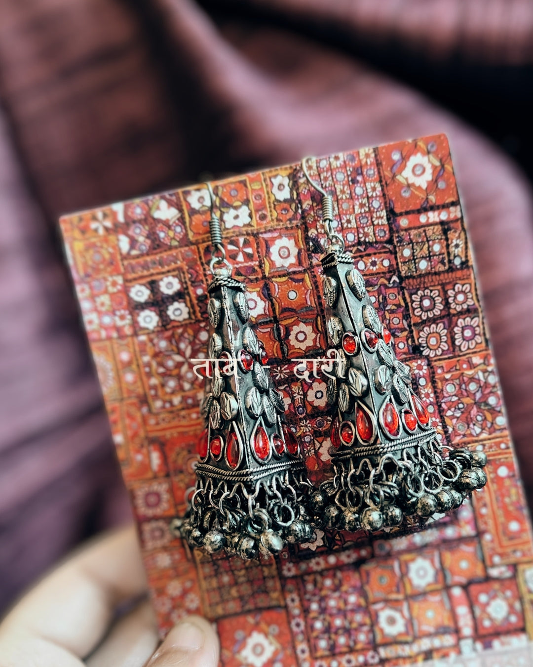 Elevate your look with our timeless Tisra jhumki earrings crafted with Oxidized silver in a pyramid shape ,adorned with colored glass stones these delicate earrings add a touch of elegance to any outfit. Care Instructions: